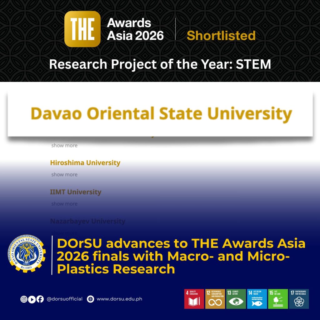 Davao Oriental State University (DOrSU) has made the shortlist for the Times Higher Education (THE) Awards Asia 2026, advancing to the finals of the Research Project of the Year: STEM category.